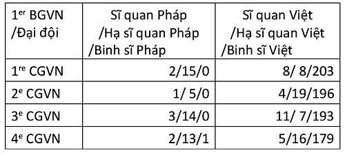 Quân số của một Tiểu đoàn Lê Dương là 52% lính Việt. Ở các tiểu đoàn Nhảy dù Thuộc địa, cứ 4 đại đội tác chiến thì 2 đại đội thuần Việt CIP (Compagnie Indochinoise de Parachutistes/ Đại đội Nhảy dù Đông Dương). Trung tâm Huấn luyện Công binh CIG (Centre d’Instruction de Génie) thành lập tháng 1-1946 tại Thủ Dầu Một niêm yết cấp số của Tiểu đoàn 1 Công Binh:
